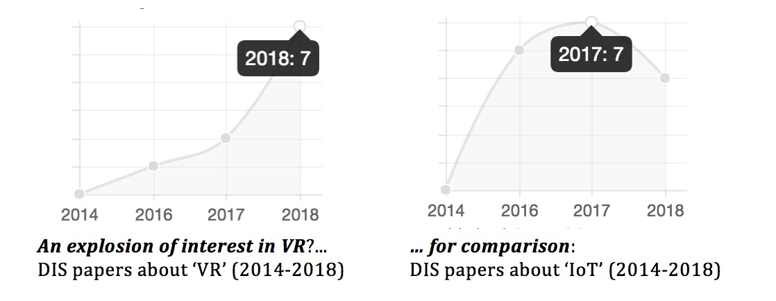 While VR has been relatively inconspicuous at DIS in recent years, 2018 has seen a steep increase in papers about VR (from 3 in 2017 to 7 in 2018). There were more papers about VR this year than there were about IoT, for example. Does this suggest a growing interest in VR at DIS?