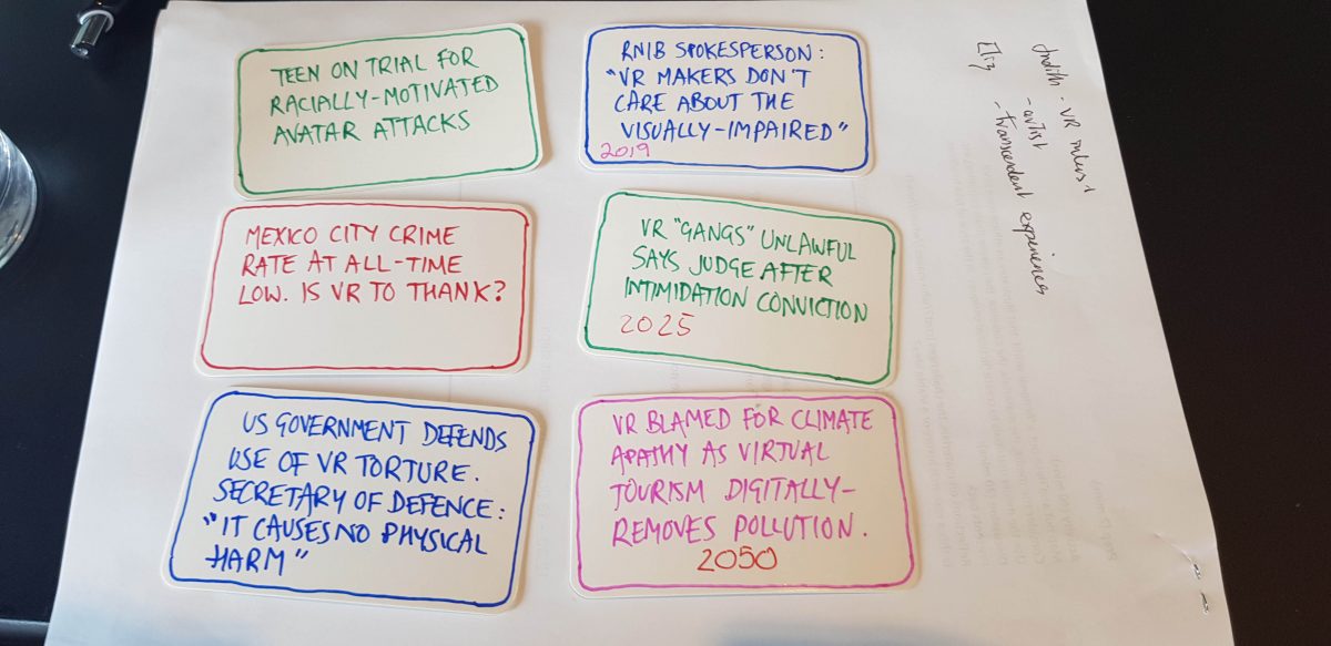 In this half-day workshop, we explored the ethics of Virtual Reality (VR) through conversations framed around design fictions.